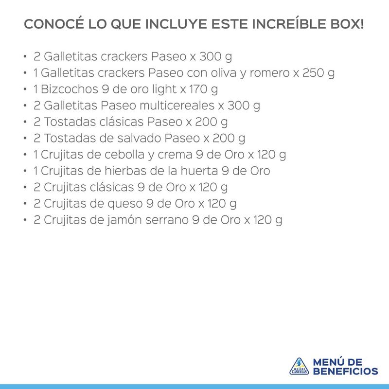 El Box Picada Amiguera reúne una selección completa de crackers, tostadas y crujitas ideales para compartir. Pensado para reuniones, previas y encuentros informales, combina variedad, sabor y practicidad con marcas reconocidas.
