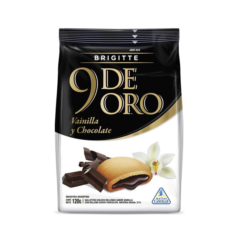 • 1 Galletita sabor vainilla rellena con chocolate 9 de Oro x 120 g